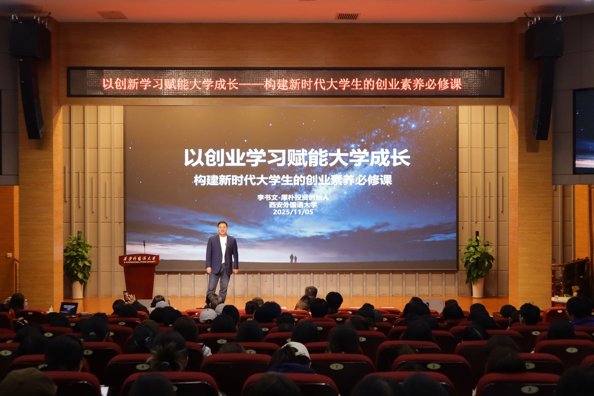 通过开场视频的导入,李书文博士以“创业者的思维方式”为主线,结合自身在办公家具、投资、教育等领域的创业经历,诠释了“发现真问题,构建解决方案,持续创造价值”的实践路径。他讲到,高校需要从“知识传授地”转型为“价值创造训练场”,让创业学习成为连接知识与实践的桥梁;学生需具备创造价值、解决问题为导向的“创业者思维”,这样才能在毕业求职时掌握主动权。现场,他以西外校友董宇辉为例,解读其如何将专业能力转化为商业价值,为学子提供了“专业即超能力、故事即品牌、韧性促转机”的深刻启示。李博士幽默风趣的演讲风格和亲切热情的互动方式,赢得了在场师生阵阵掌声。