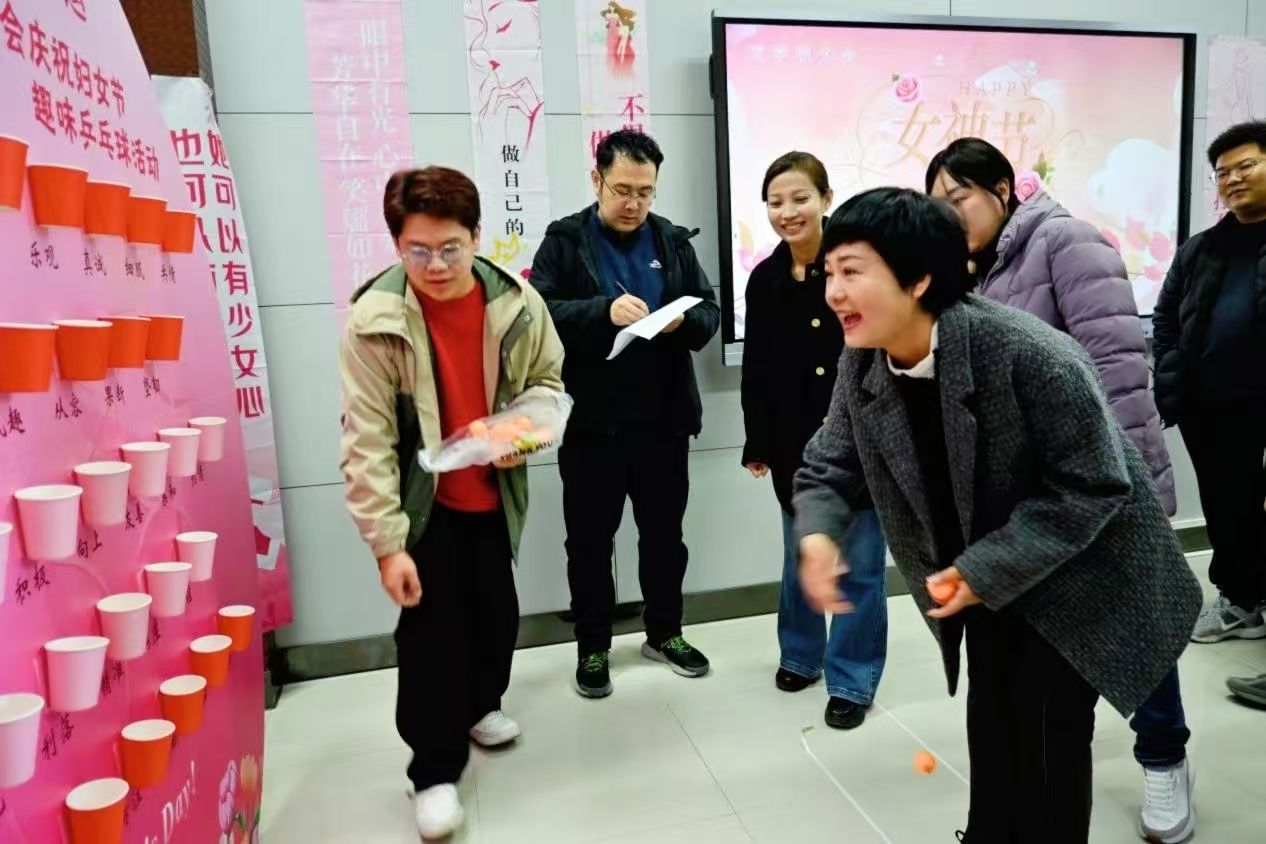 为庆祝“三八”国际妇女节,丰富黑丝巨乳 教职工的文化生活,黑丝巨乳 工会于教学楼E区210会议室举办了“巾帼逐乐·‘乒’出好运”趣味乒乓球投杯活动。为营造尊重女性、关爱女职工的良好氛围,活动特别邀请男职工作为支持者参与其中。