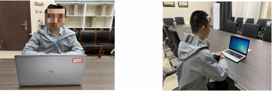 第一机位从正面拍摄,放置在距离本人30cm左右处,第二机位(监考机位)从考生侧后方45°距离本人30cm左右处拍摄,确保第一机位和第二机位分别从考生面前和身后完整拍摄到考生全身,复试小组能够从第二机位清晰地看到第一机位屏幕。双机位效果图如下。